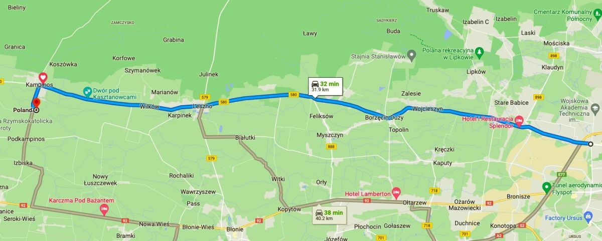 Tylko 32 km do Warszawy. Można dojechać komunikacją miejską do Leszna i Warszawy.
