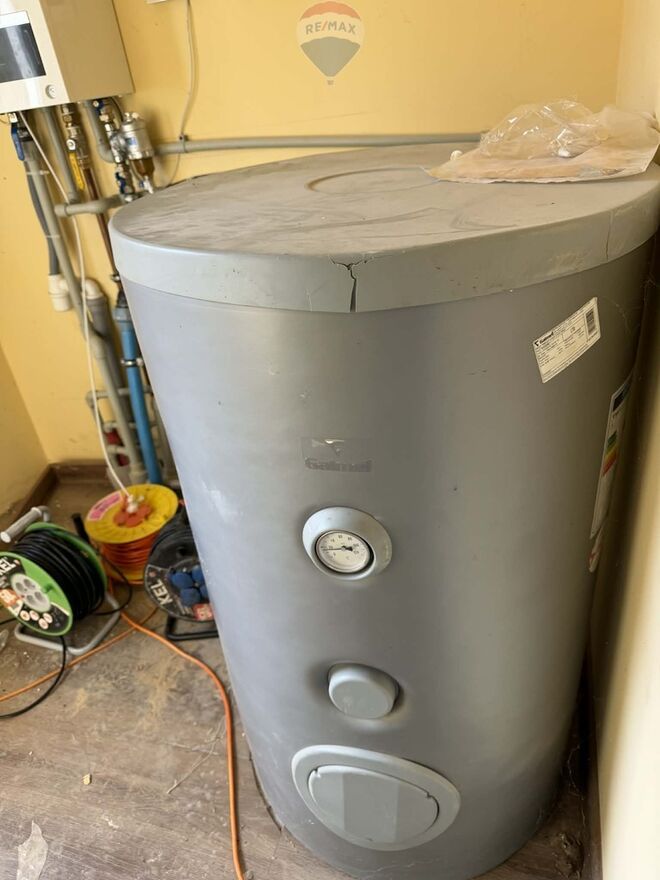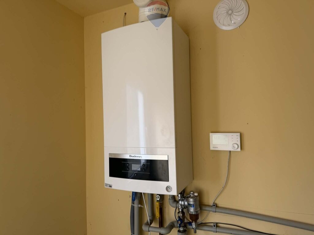 znajduje się piec marki Buderus i zasobnik na wodę firmy Galmet, w